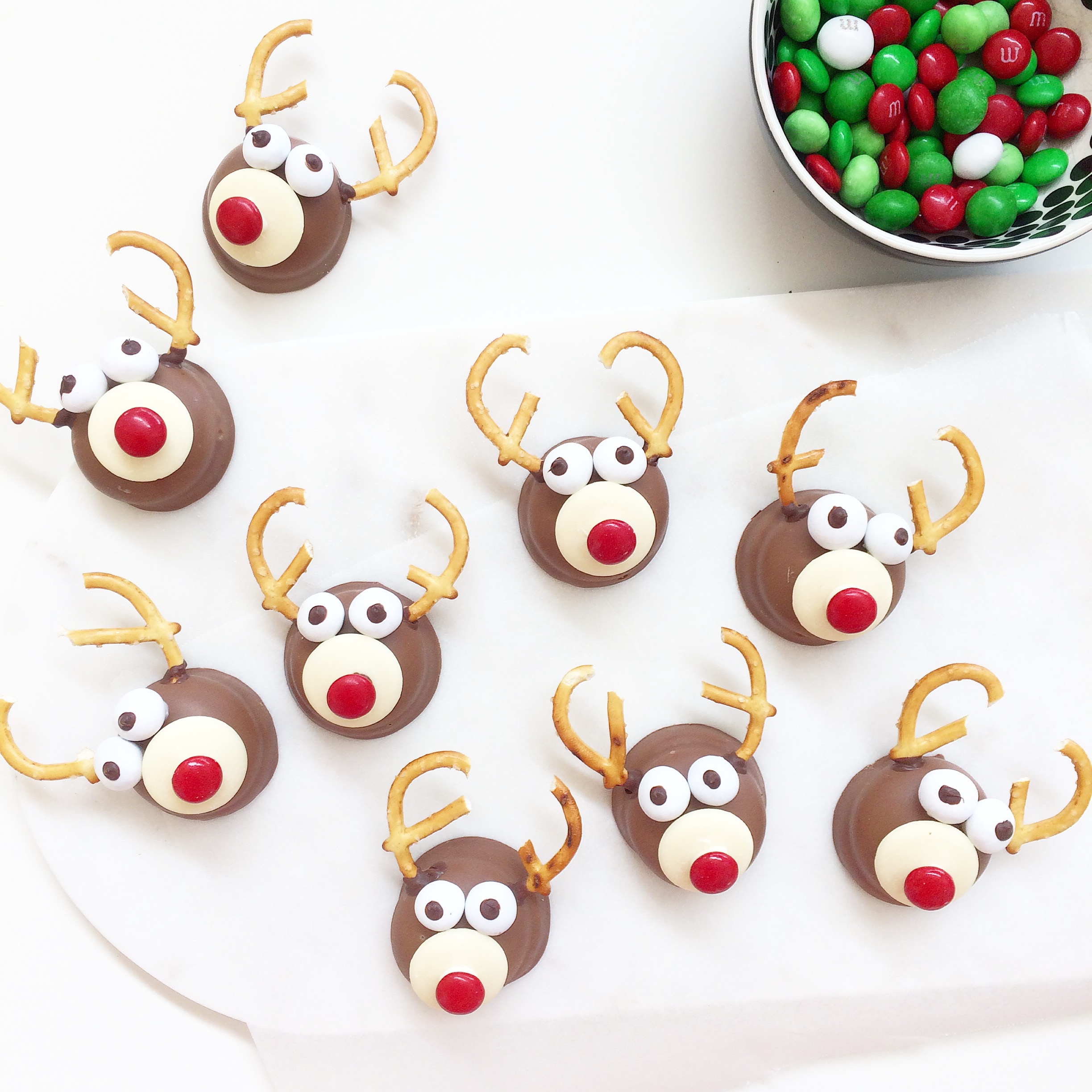 Eyes: I used white M&M’s. These are available this time of year in a Christmas pack. I melted some dark chocolate for the centre of the eye, but you can use whatever is easiest.